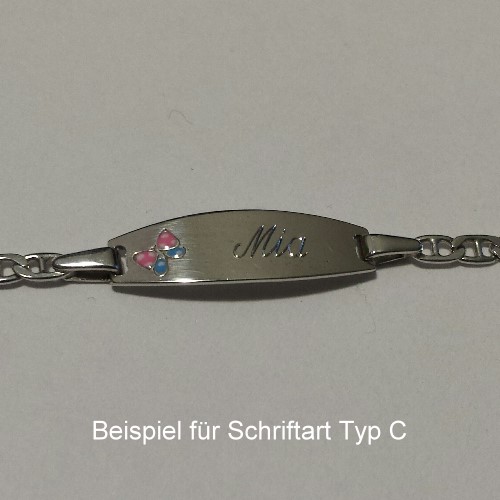Das Kinderarmband mit Gravur hat eine Gesamtlänge von 16 cm und kann mittels Verstellöse auf 14 cm verstellt werden. Das Identitätsarmband eignet sich ideal für Babys und Kleinkinder als Geschenk zur Taufe, zur Geburt oder zum Geburtstag. Auf dem Schild kann der Name des Kindes eingraviert werden (gern auch ein Datum auf der Rückseite). Auch als Babyarmband, Namensarmband oder Schildarmband bekannt. Bitte wählen Sie aus, ob Sie eine Gravur (Aufpreis 2,50 EUR) wünschen oder nicht. Bei einem Gravurwunsch geben Sie bitte im Eingabefeld für den Gravurtext an, welcher Text eingraviert werden soll (max: 10 Zeichen pro Seite sind möglich)